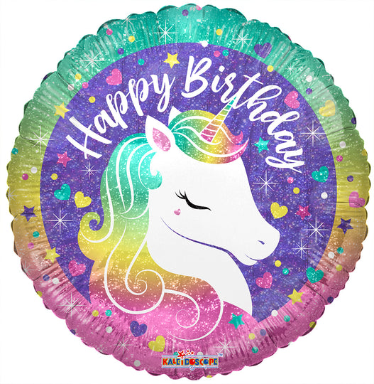 Globo holográfico de aluminio con diseño de unicornio arcoíris de cumpleaños de 18"