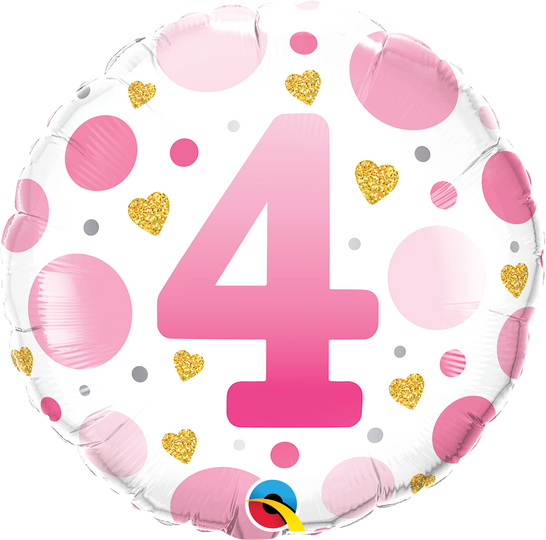 Globo metalizado con puntos rosados, redondo, de 18" y 4 años de edad