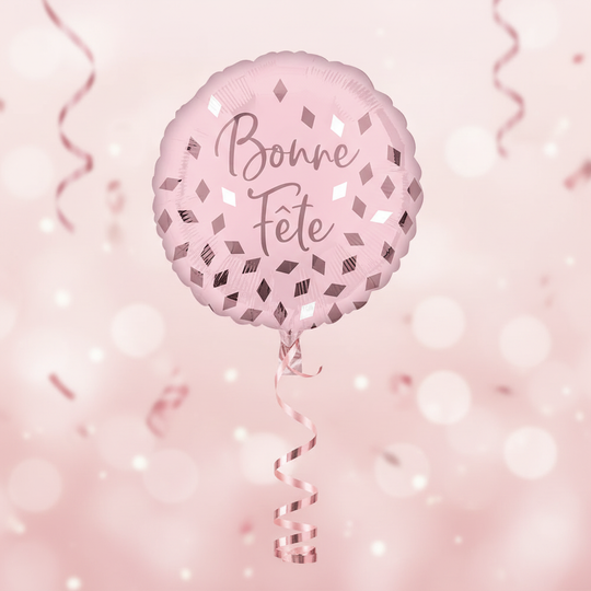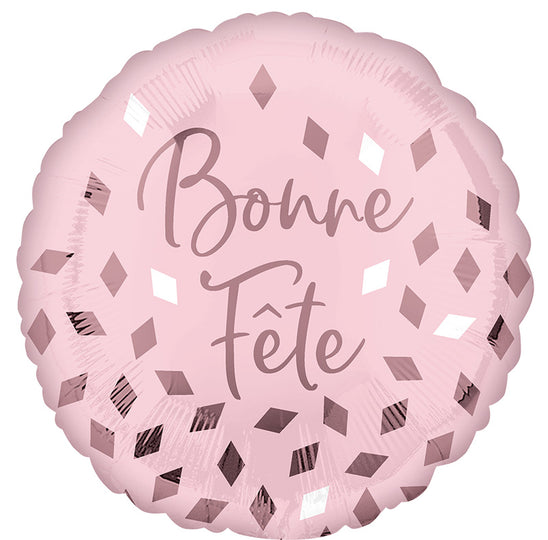 Celebrate in style with this 18" Bonne Fête Blush Foil Balloon. This round balloon features a soft blush pink background adorned with shimmering diamond-shaped accents in metallic hues. The elegant script "Bonne Fête" is prominently displayed in the center, making it perfect for birthdays or any festive occasion. Add a touch of elegance and joy to your celebration with this beautiful foil balloon.
