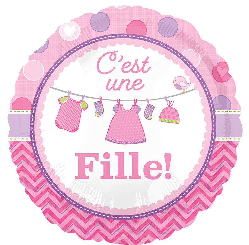 Celebrate the arrival of a baby girl with this charming 18" "C’est une Fille!" Shower with Love Foil Balloon. This delightful round balloon features a pink and purple design with adorable baby clothes hanging on a clothesline, including a dress, onesie, socks, and a hat. The balloon is adorned with heart and polka dot patterns along the border, adding a touch of sweetness to your celebration. The French phrase "C’est une Fille!" meaning "It's a Girl!" is prominently displayed in the center, making it perfect for baby showers and welcoming parties.