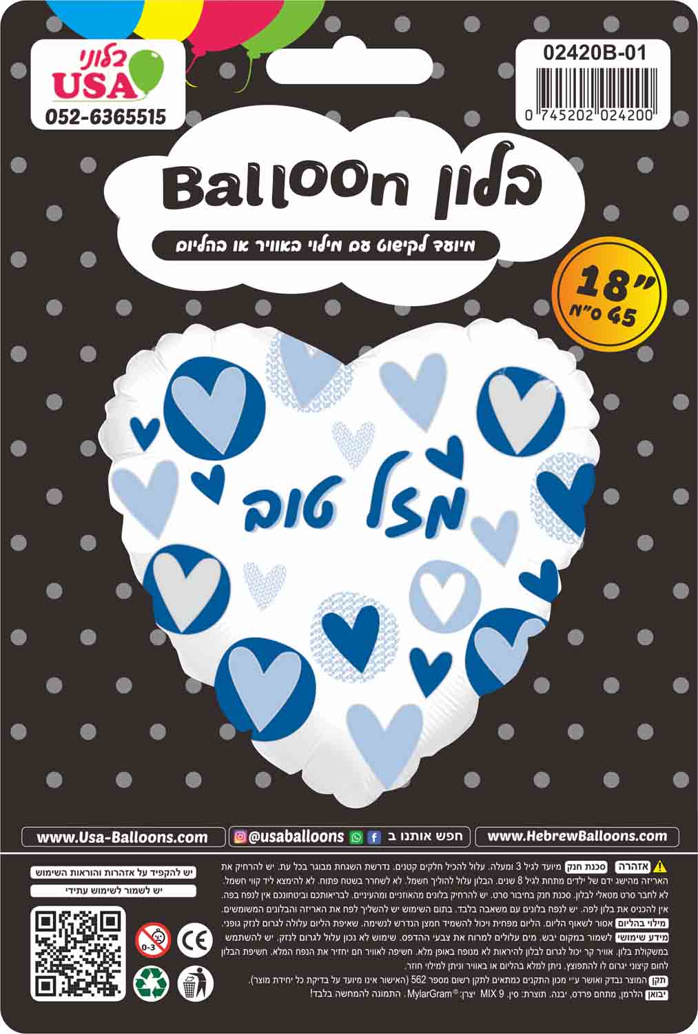Globo de aluminio hebreo con corazones azules Mazel Tov de 18"