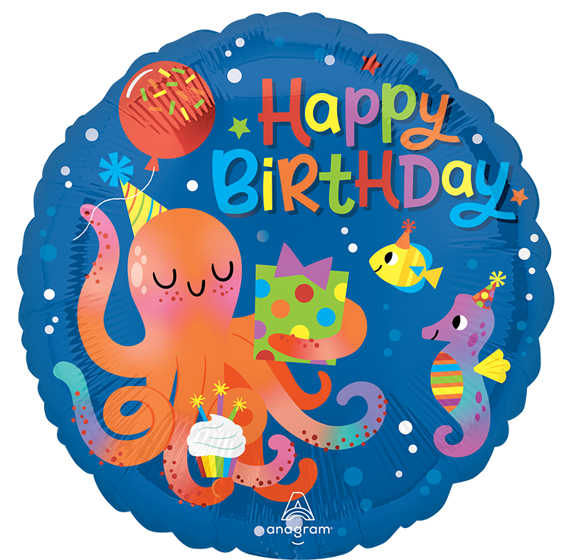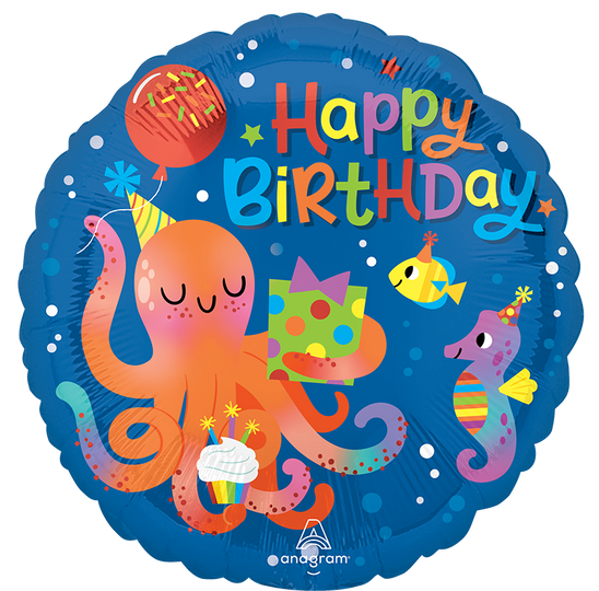 Celebrate a special birthday with our 18" Standard Cute Octopus Birthday Foil Balloon! Featuring an adorable octopus holding a gift and cupcake, surrounded by festive sea creatures and vibrant "Happy Birthday" text, this balloon is perfect for adding a splash of fun to any party. Made from high-quality foil, it ensures long-lasting inflation and durability. Ideal for both kids and adults, this charming balloon is sure to bring smiles and joy to the celebration!