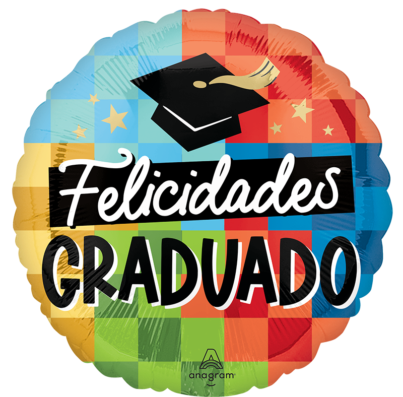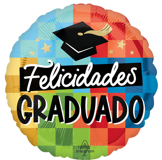 Celebrate the achievements of your graduate with this vibrant 18" Standard Diploma, Check! Felicidades Graduado Foil Balloon. The balloon features a colorful checkered pattern in shades of blue, green, red, and orange. At the center is a black graduation cap with a golden tassel, symbolizing academic success. The bold white script reads "Felicidades" (Congratulations) above the large, black block letters spelling out "GRADUADO" (Graduate). Perfect for adding a festive touch to any graduation celebration!