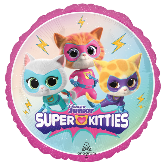 Bring some superhero fun to your celebrations with the 18" Super Kitties Foil Balloon. This vibrant round balloon features three adorable kitties dressed in colorful superhero costumes, ready to save the day. The design includes a pink and purple border with lightning bolts for an extra touch of excitement.