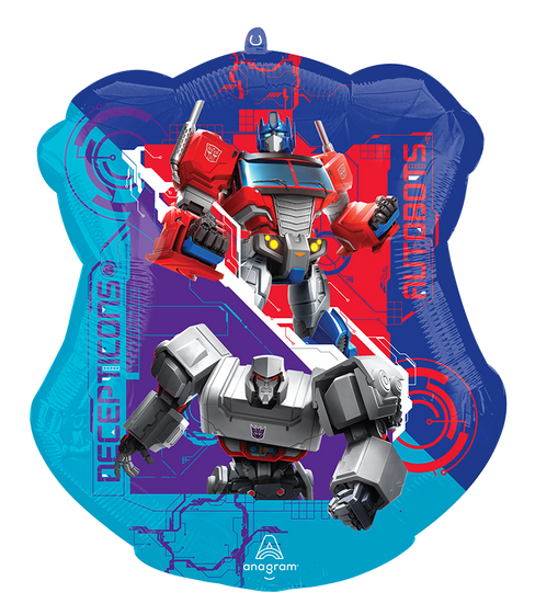 Bring the excitement of Transformers to your party with this 22" SuperShape Transformers Foil Balloon. Featuring vibrant images of iconic characters Optimus Prime and Megatron, this balloon showcases bold colors of red, blue, and gray. The design is set against a dynamic background with the words "AUTOBOTS" and "DECEPTICONS" prominently displayed on either side. Perfect for any Transformers fan, this balloon adds a fun and adventurous touch to your celebration.