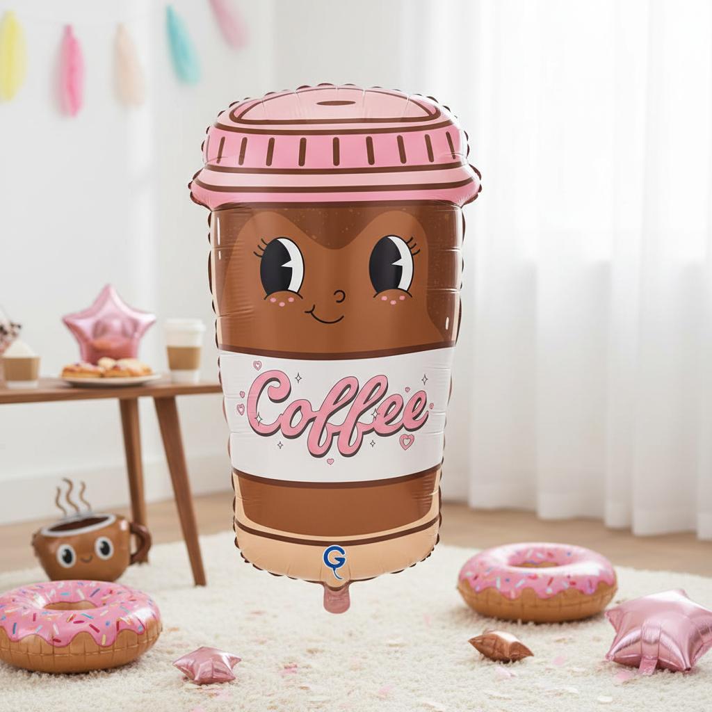 Bring a touch of fun to your celebration with this 24" Coffee To Go Cup Foil Balloon! Shaped like a delightful coffee cup, this balloon features a charming brown cup with a cute smiling face and large, expressive eyes. The cup is topped with a pink lid, adding a pop of color to its design. Around the middle, a white band displays the word "Coffee" in playful pink script, surrounded by tiny hearts and stars. Perfect for coffee lovers, birthdays, or any festive occasion, this balloon is sure to bring smiles and joy.