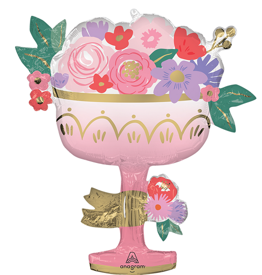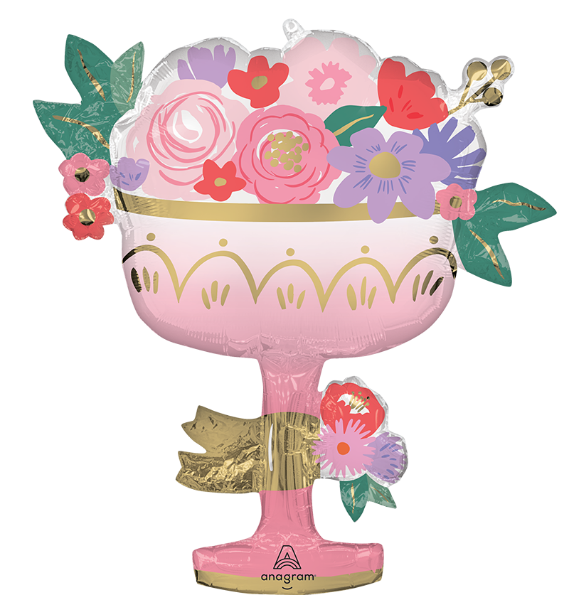 Celebrate in style with this 29" SuperShape Floral Toast Foil Balloon. This delightful balloon features a charming design of a pink goblet adorned with a scalloped gold trim, filled with an array of colorful flowers in shades of red, pink, purple, and green. Perfect for adding a touch of elegance to any occasion, this balloon is sure to impress your guests. Ideal for birthdays, anniversaries, or any festive celebration, this floral toast balloon brings a whimsical and cheerful vibe to your decor.