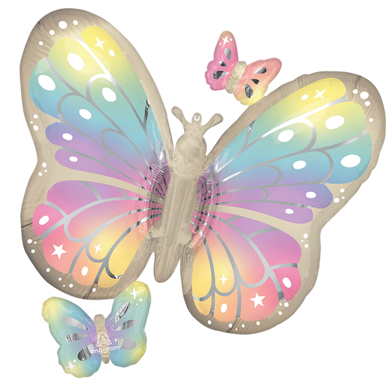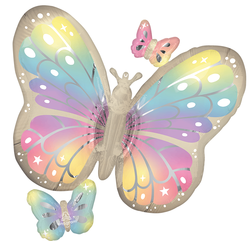 Bring a touch of whimsy and charm to your celebration with the 29" SuperShape Satin Fluttering Dreams Butterflies Foil Balloon. This stunning balloon features a large butterfly design with vibrant, rainbow-colored wings adorned with delicate patterns and stars. The soft satin finish adds an elegant sheen, making it perfect for birthdays, garden parties, or any special occasion. The balloon also includes two smaller butterflies in coordinating pastel shades, enhancing the enchanting theme. Elevate your decor with this beautiful and eye-catching foil balloon.