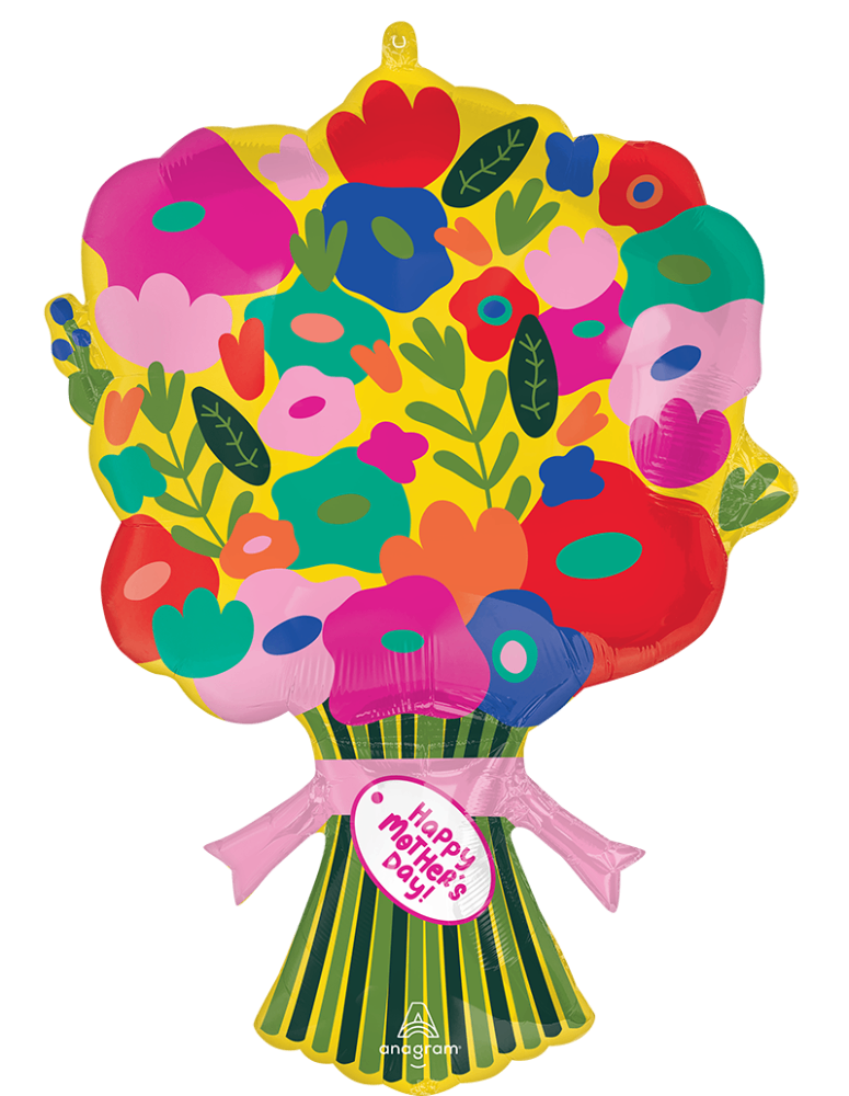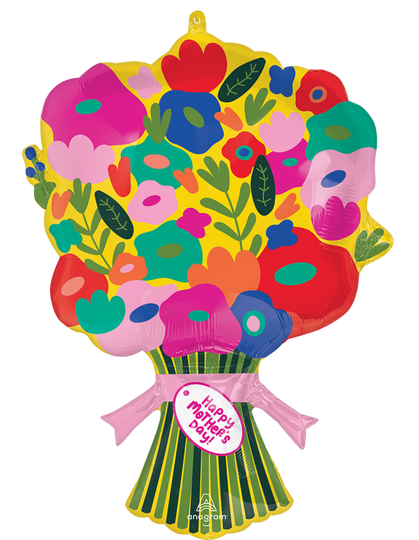 Celebrate Mother's Day with this vibrant 30" SuperShape Happy Mother's Day Hothouse Petals Foil Balloon. This eye-catching balloon features a beautiful bouquet design filled with colorful flowers in shades of red, pink, blue, green, and orange. The flowers are complemented by lush green leaves, all tied together with a pink ribbon. The balloon displays the heartfelt message "Happy Mother's Day!" making it the perfect addition to any Mother's Day celebration.