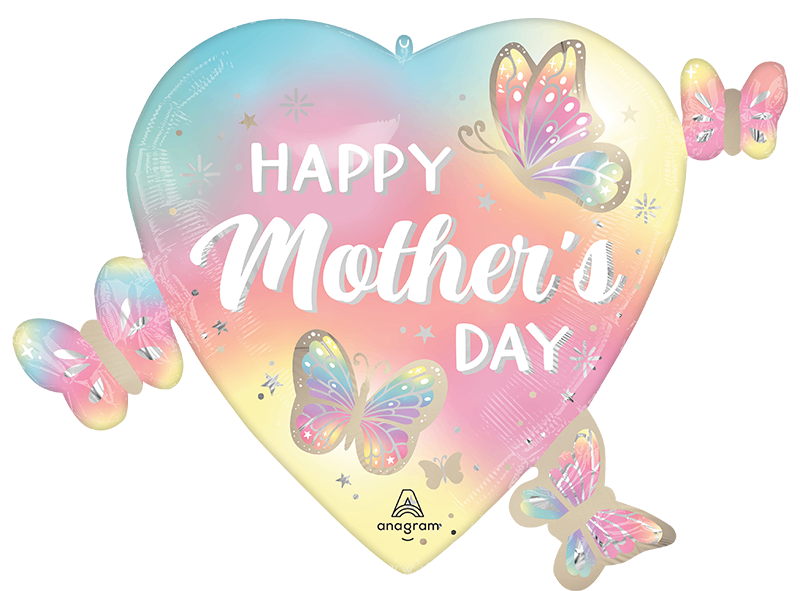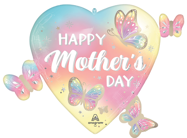 Celebrate Mother's Day with this enchanting 32" SuperShape Satin Foil Balloon. Shaped like a heart, this balloon features a beautiful pastel gradient background adorned with vibrant butterflies and delicate stars. The heartfelt message "Happy Mother's Day" is prominently displayed in elegant white script. Perfect for adding a whimsical touch to your Mother's Day celebrations, this balloon will make any mom feel special and appreciated.