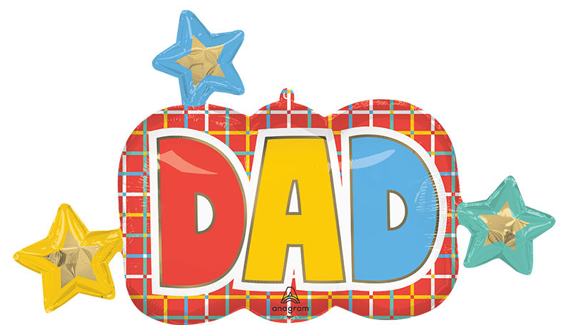 Celebrate your dad in style with this 36" SuperShape Graphic Grids Dad Foil Balloon. This vibrant and eye-catching balloon features the word "DAD" in bold, colorful letters - red, yellow, and blue - set against a dynamic red and white grid background. The design is accented with three star-shaped balloons in blue, yellow, and green, each with a metallic gold center. Perfect for Father's Day, birthdays, or any occasion to show appreciation, this balloon will make a memorable statement.
