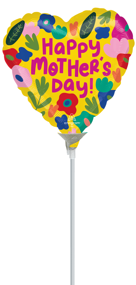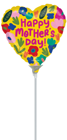 Celebrate Mother's Day with this vibrant 9" Airfill Only Foil Balloon, perfect for adding a touch of cheer to any celebration. The heart-shaped balloon features a bright yellow background adorned with colorful floral designs in shades of red, blue, pink, green, and purple. The bold, pink lettering reads "Happy Mother's Day!" making it a delightful way to express your love and appreciation. Please note that sticks are sold separately.
