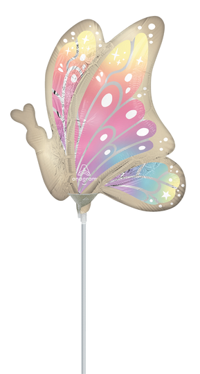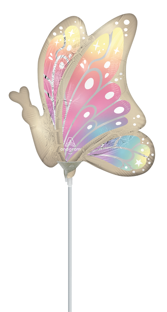 Elevate your celebrations with the Mini Shape Satin Fluttering Dreams Foil Balloon. This charming balloon features a delicate butterfly design with vibrant, multicolored wings adorned with whimsical patterns and stars. The soft satin finish adds an elegant touch, making it perfect for birthdays, garden parties, or any special occasion. Please note that this balloon is air-fill only and sticks are sold separately. Bring a touch of magic to your event with this enchanting butterfly balloon!