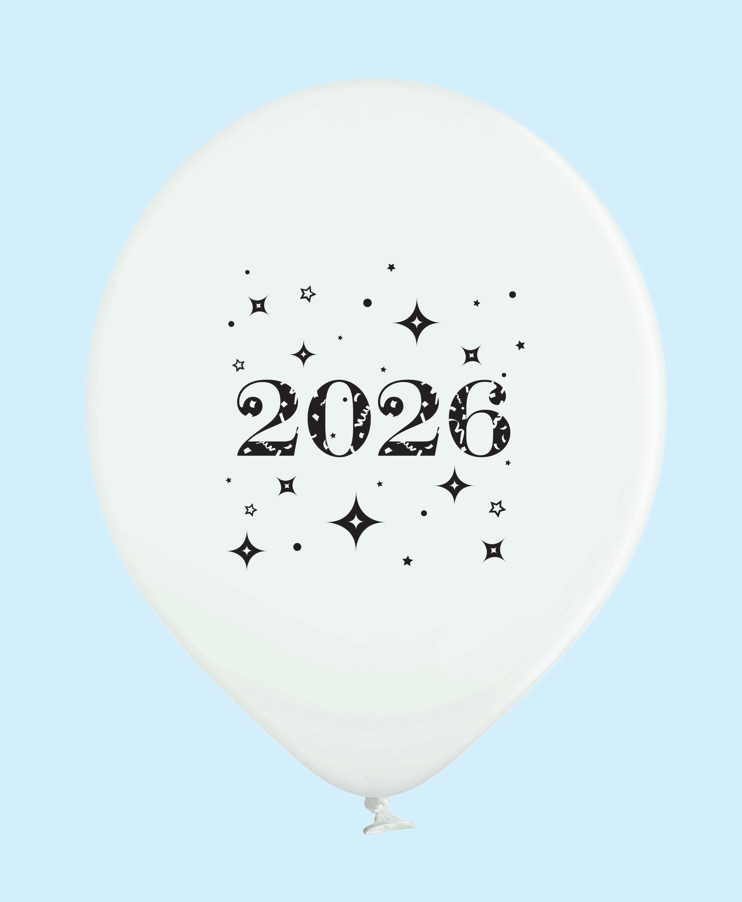 11" Year 2026 Stars Printed Latex Balloons White (25 Per Bag)