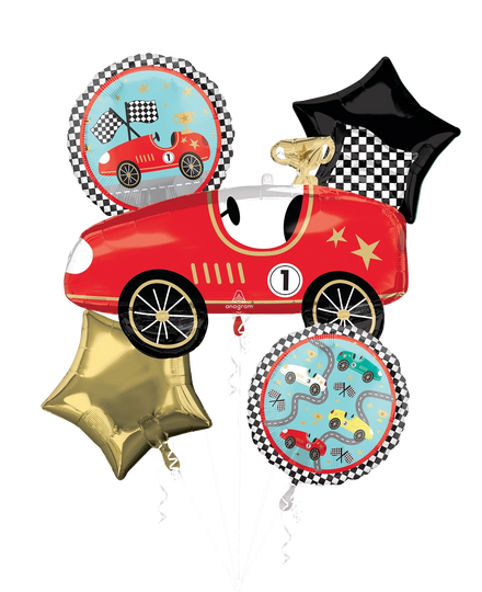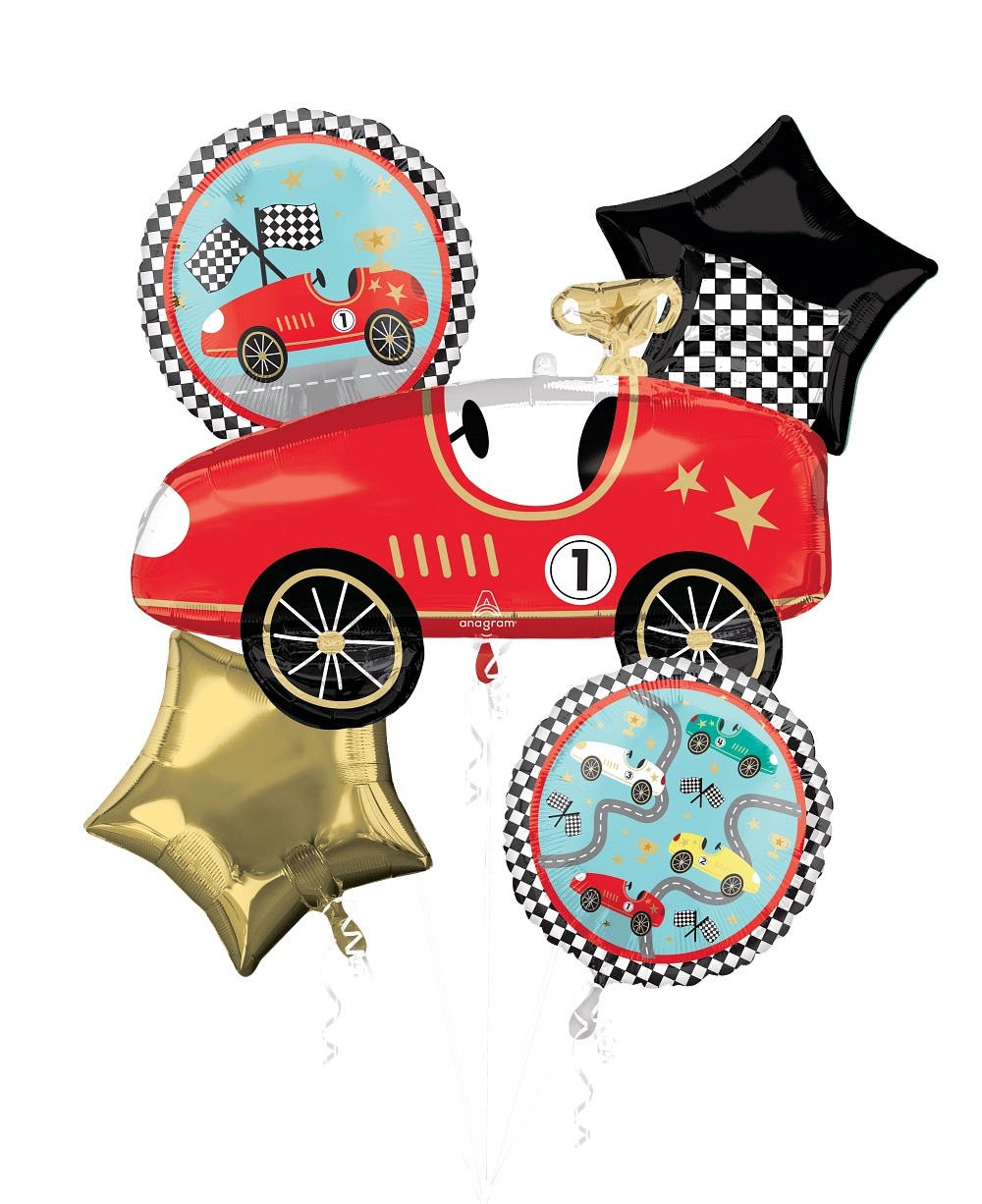 Bring the thrill of the racetrack to your party with this exciting Bouquet Race Cars Foil Balloon set!