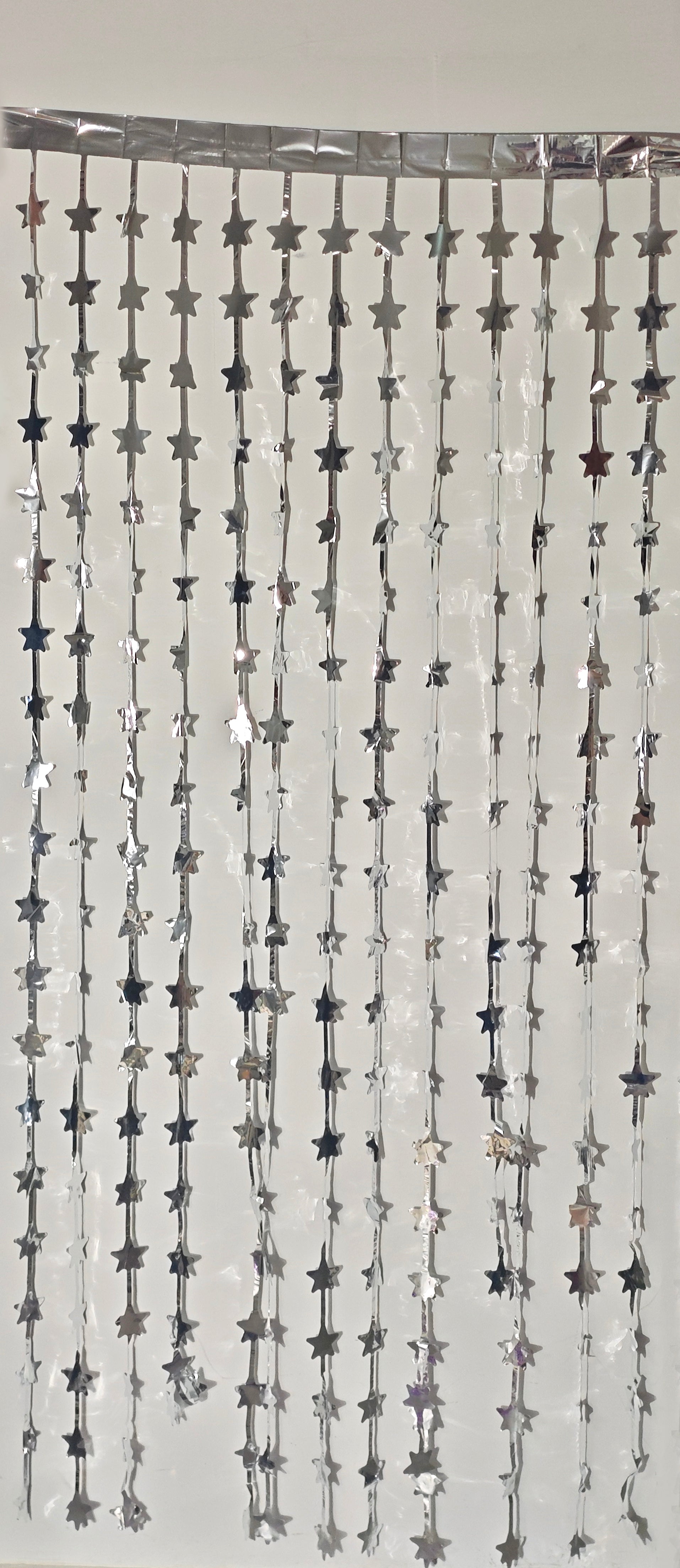Telón de fondo de cortina de estrellas con flecos de aluminio de 6,5 pies x 3,25 pies, MylarGram plateado