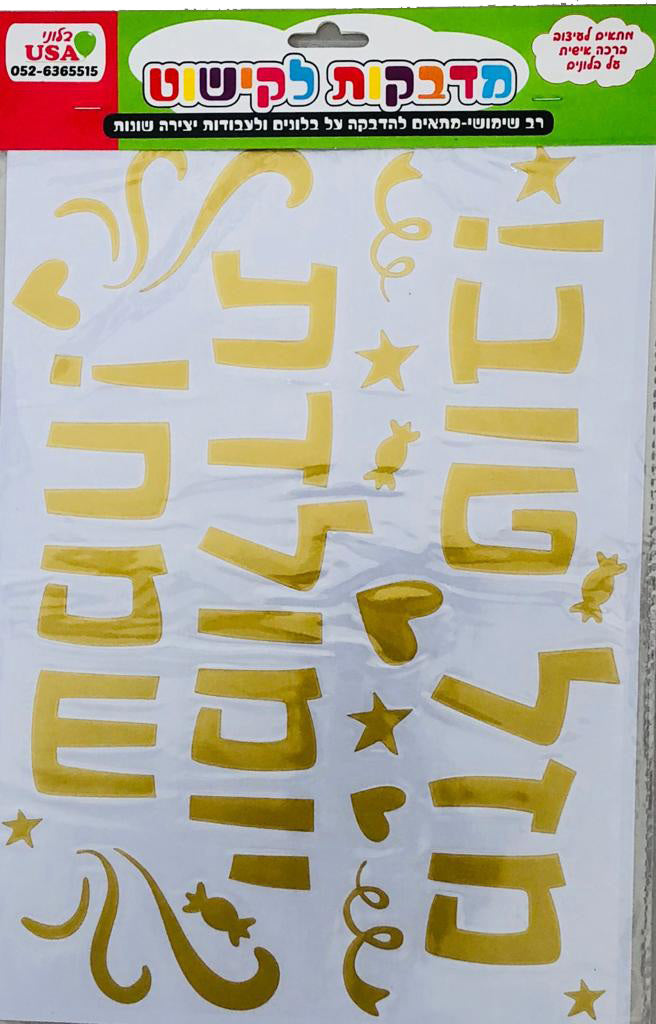 Celebrate special occasions with this elegant Sticker Set in Hebrew. The set features gold-colored stickers with the phrases "Mazal Tov" and "Happy Birthday" in Hebrew, along with decorative elements such as stars, hearts, and swirls. Perfect for adding a festive touch to gifts, cards, and party decorations.