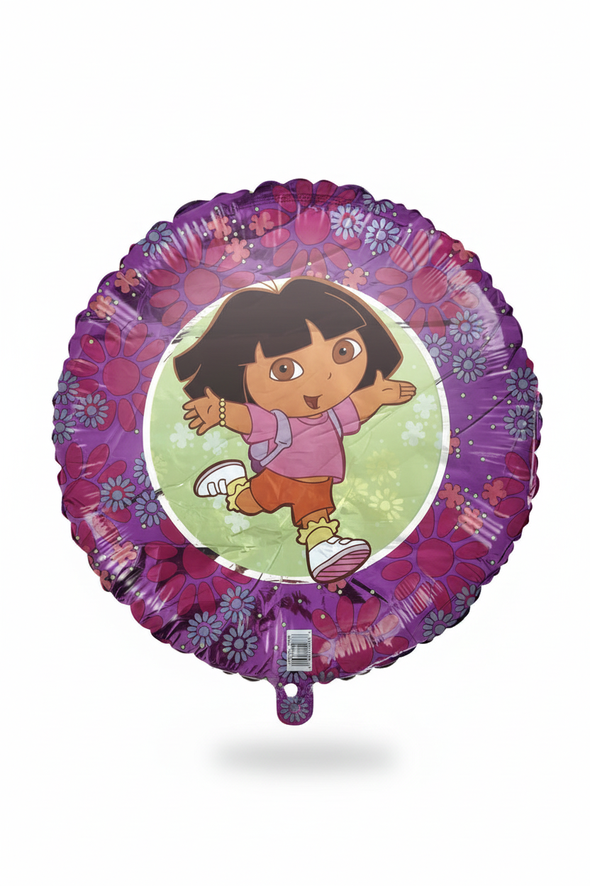 The round foil balloon showcases Dora in her classic outfit, set against a lively background of purple and pink flowers. The durable foil material ensures long-lasting fun and can be filled with either helium or air.