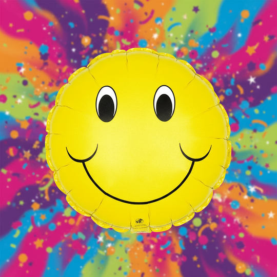 Ballon rond en aluminium de 45 cm, au design joyeux et classique, orné d'un smiley jaune. Ce ballon est double face : il arbore l'emblématique smiley (fond jaune avec des points noirs pour les yeux et un sourire noir incurvé) imprimé des deux côtés, pour un rendu impeccable sous tous les angles.