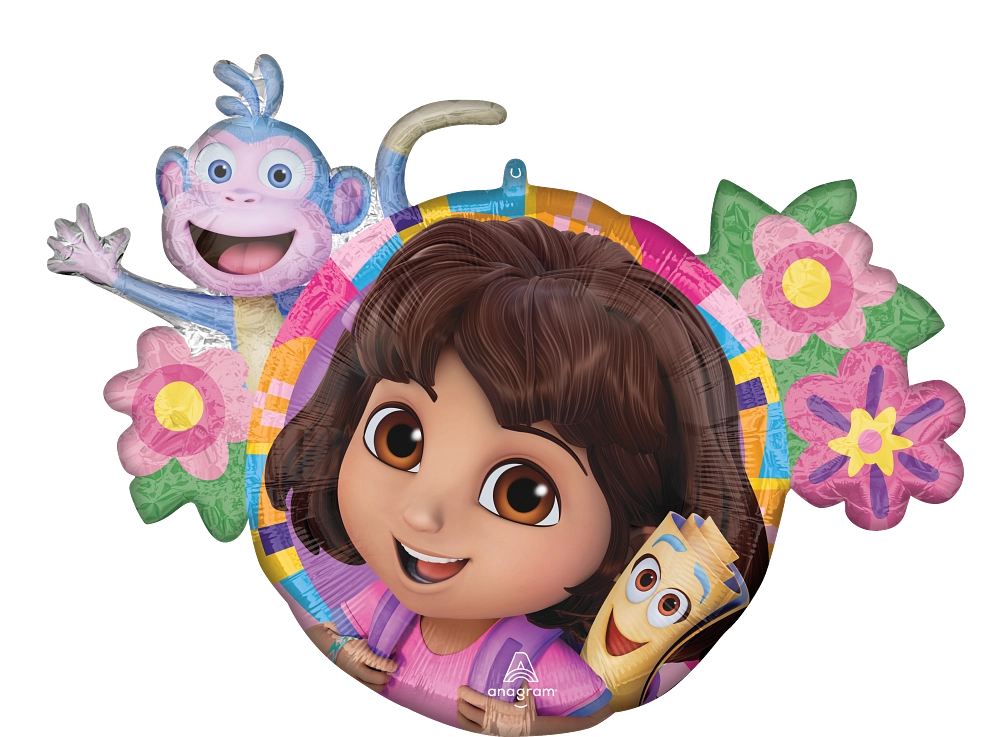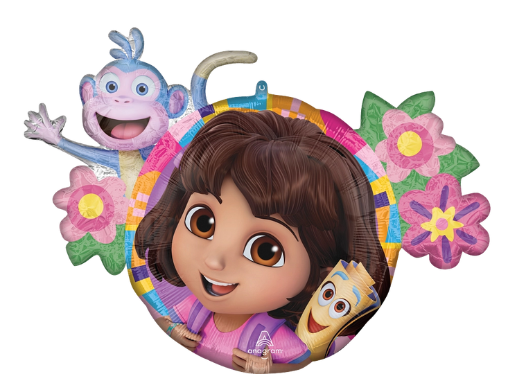 Enhance your celebration with the 29" Roly Polies Dora the Explorer Foil Balloon. This colorful balloon features a large, round design with Dora's cheerful face at the center, holding her friend Forky. Surrounding Dora are vibrant flowers and her playful monkey companion, Boots, adding a touch of adventure to your party decor. Perfect for birthdays and themed events, this foil balloon is sure to delight fans of all ages.