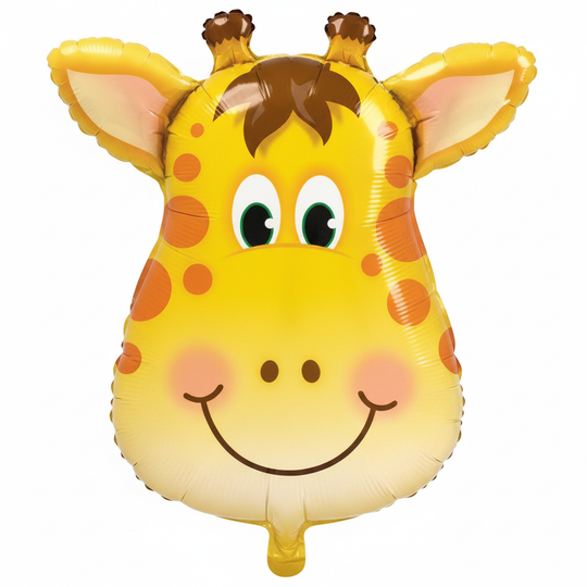 Bring a touch of fun and whimsy to your next event with this 32" Jolly Mylar Giraffe Balloon. This delightful balloon features a cheerful giraffe face with big, expressive eyes, rosy cheeks, and a friendly smile. The vibrant yellow color, accented with orange spots and brown hair tufts, makes it an eye-catching addition to any celebration.