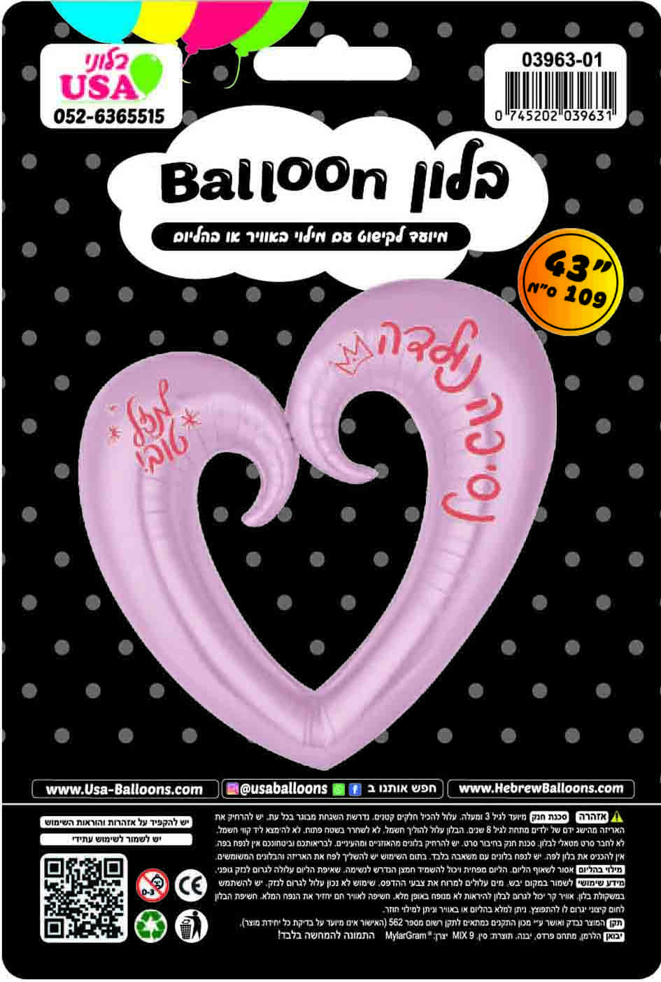Ballon en aluminium Mazel Tov Baby Girl rose à cœur ouvert hébreu de 43 pouces