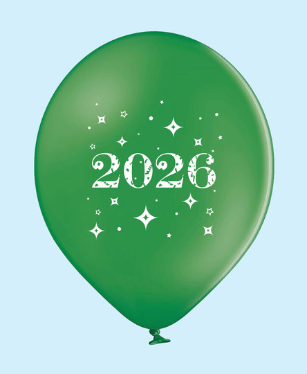 11" Year 2026 Stars Printed Latex Balloons Green (25 Per Bag)