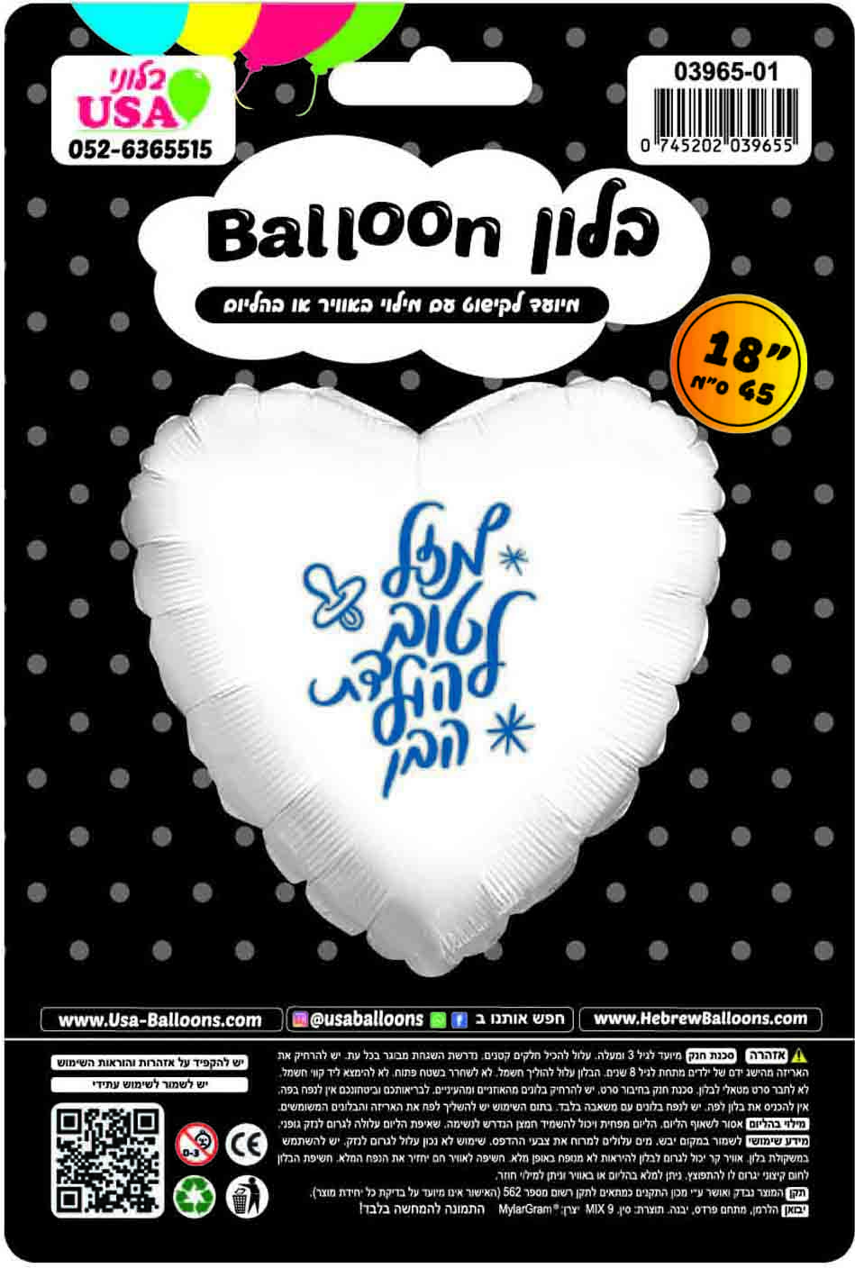 18" Mazel Tov Baby Boy White Heart Hebrew Foil Balloon