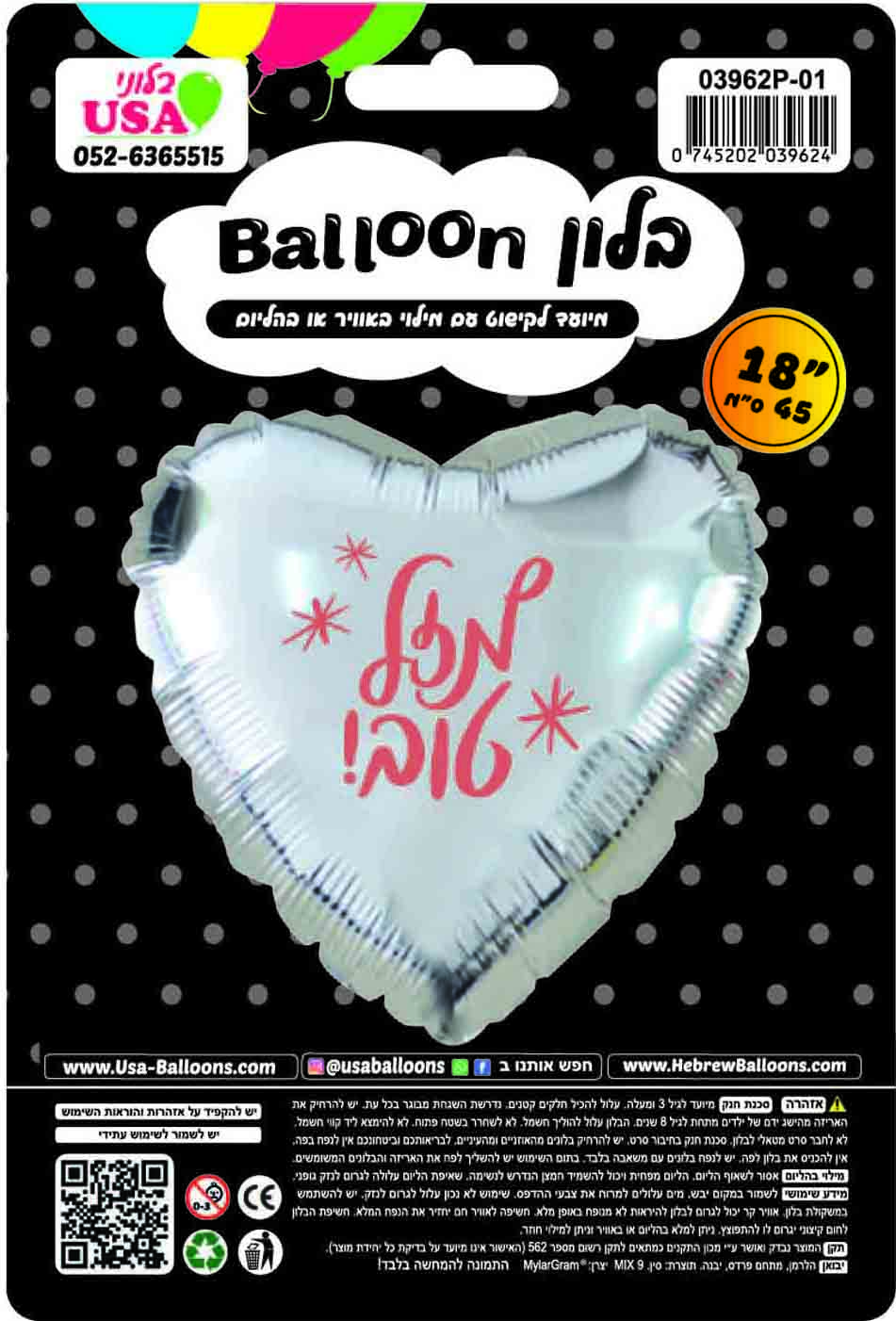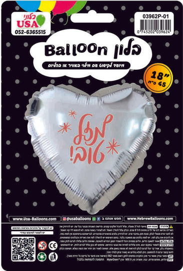 18" Mazel Tov Heart Silver/Pink Hebrew Foil Balloon