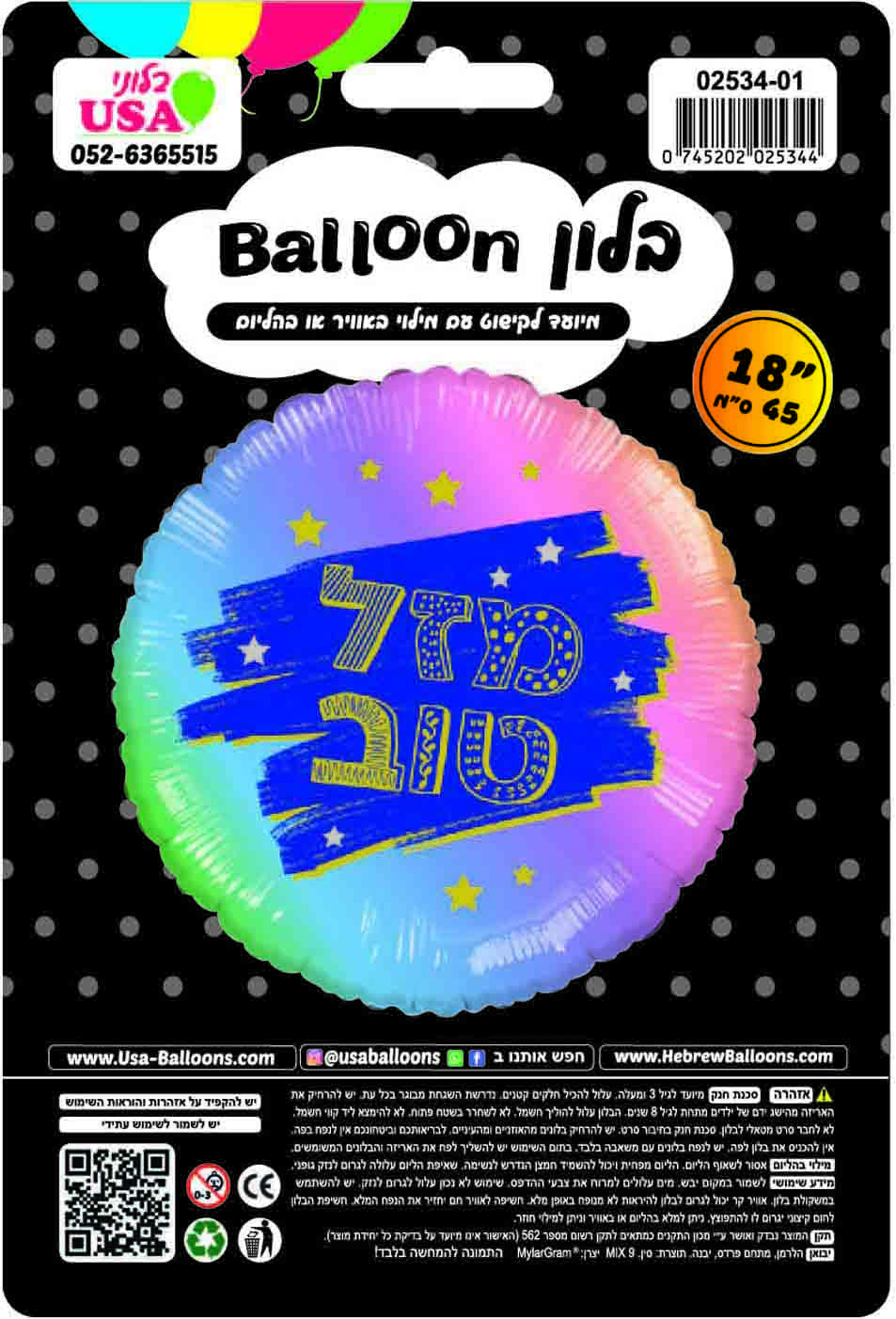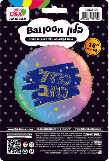 18" Mazel Tov Round Blue Rainbow Hebrew Foil Balloon