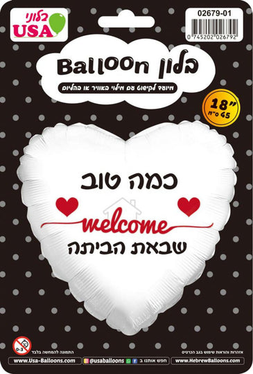 18" Welcome Home White Heart Hebrew Foil Balloon